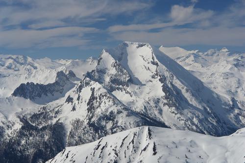 Das Weißeck - bildfüllend. Durch die markante Steilrinne verläuft eine Schiroute im Schwierigkeitsgrad 4.