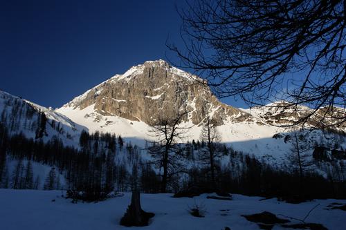 | Vorbei an den morgensonnenbeschienenen Felsen von Rießlwand und Permuthwand. Links liegt unsere Abfahrtsroute bereits am frühen Morgen in der Sonne - bei der Abfahrt um 12:00 Uhr finden wir dort besten Firn vor. |