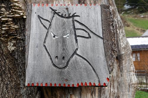 | Beim Start im kleinen Ort Niederstuttern treffen wir auf diese Tafel - Ob es sich dabei um ein Warnschild vor Kampfkühen handelt, konnten wir nicht herausfinden. Ebenso wenig ist bekannt, was es mit den zahlreichen blutroten Kerben auf sich hat (für jedes Opfer eine ?). |