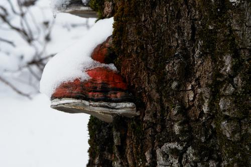 Rote Farbtupfer (hier auf einem Baumpilz) weisen uns den Weg über den direkten Südanstieg.