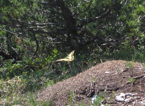 | Und eine besondere tierische Rarität ist ein herrlicher Schmetterling, der während unserer gesamten ca. dreiviertelstündlichen Rast ständig um uns herum flattert. Aber jedes Mal wenn er sich niederläßt, und ich meinen Fotoapparat zücke, ist er auch schon wieder entfleucht. |