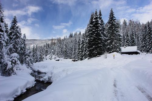 Bis zur Rahnstube ist die Forststraße geräumt, aber mit einer guten Schneedecke ausgestattet. Hier zweigt man nach rechts ab.