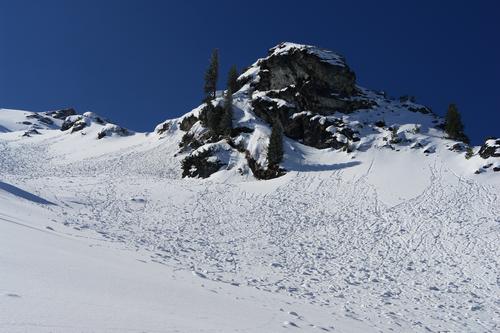 Etliche Lawinenknollen lösen sich aus den sonnenbeschienenen Steilhängen.