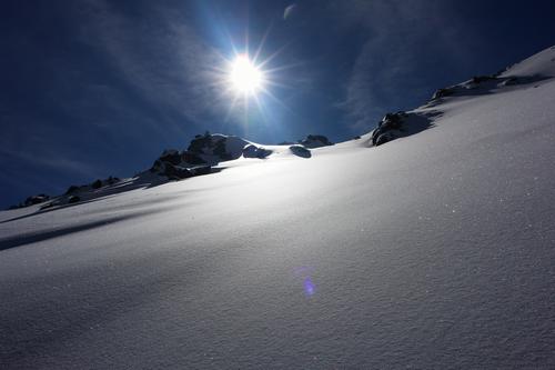 ... dann wieder etwas flacher im unberührten Pulverschnee.