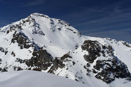 Am Gipfel des Vogelsang (der Schneehügel links unten). Rechts der dunkle Felsen des Kornreitwipfel - links hinten das Schiedeck.