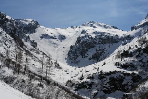 Und noch einmal das obere Tourengebiet mit unseren deutlich erkennbaren Abfahrtsspuren aus dem Patzenkar gesehen.