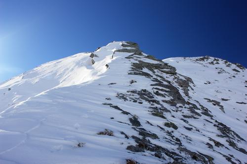 Leicht ausgesetzt geht es am überwechteten Grat bergan.
