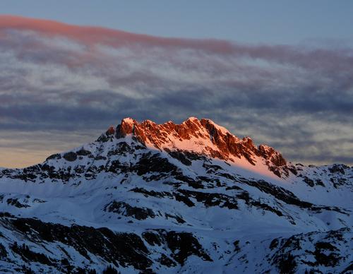 | Herrliches Farbenspiel am Himmel und auf den Bergspitzen über dem Riedingtal. |
