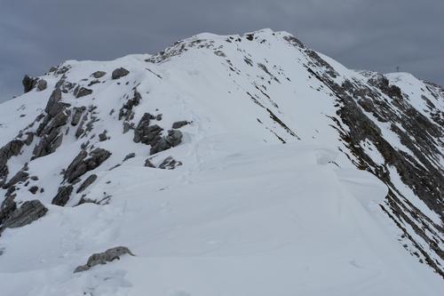 | Am überwechteten, teilweise schmaler werdenden Grat folge ich Fußspuren 2-er Wanderer, die am Vortag den Gipfel besucht haben. Rechts hinten erkennt man das Gipfelkreuz. |