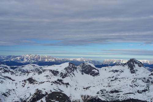 | Während bei mir um die Mittagszeit neben dem kalten Wind auch stärkere Bewölkung hinzukommt, ist im Norden um Hochkönig (links) und das Tennengebirge (rechts) blauer Himmel sichtbar. |