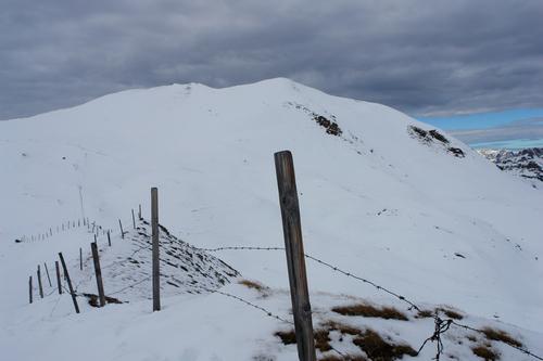 | Zurück in die Riedingscharte - mir gegenüber mein erster Gipfel des heutigen Tages. Über den Rücken auf der rechten Seite bin ich auf den Gr. Reicheschkogel aufgestiegen, über die Wiesenhänge in Bildmitte heruntergekommen. Der Zaun weist den Weg in die Riedingscharte ... |