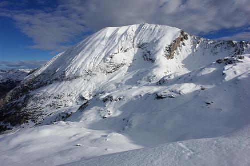 | Die Sonne kommt jetzt wieder stärker zum Zug. Ein herrliches Plateau mit dem zugefrorenen Riedingsee. Darüber - mächtig - das Weißeck. |