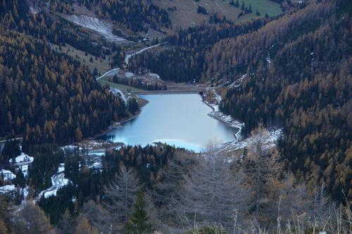 | Unter mir der Schliereralm See, an dessen linkem (nordseitigen) Ufer die Mautstraße hinaus Richtung Zederhaus verläuft. |