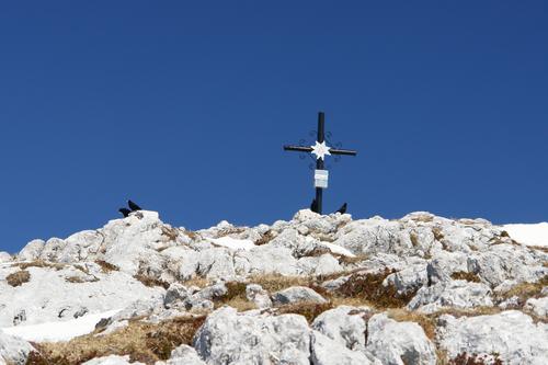Etliche Vögel tummeln sich um das Gipfelkreuz ...