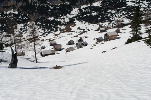 Selbst am Nachmittag noch gute Firnbedingungen bei der Abfahrt zur Augstwiesalm und den weiter unten im Talboden liegenden Augstwiesen.