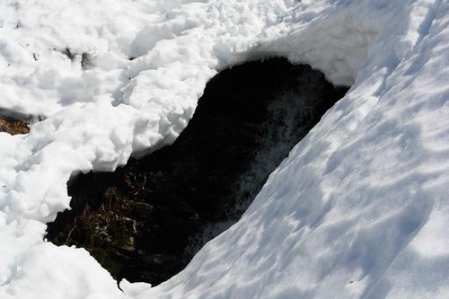 | Aus allen Ecken und Enden vernimmt man ein für das Tote Gebirge untypisches Gurgeln, Plätschern und Rauschen. Kleine Bächlein unterhöhlen die Schneedecke. |
