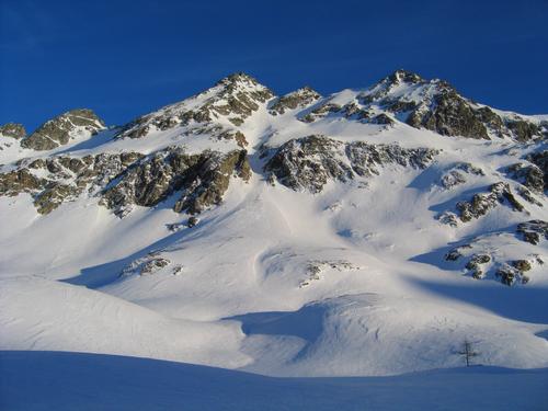 | Die Gipfelkette von den Murspitzen über Giglachalmspitze zur Grobfeldspitze, die ich bei der Vetternspitzen-Tour am 22.12.2007 von der gegenüberliegenden Seite gesehen habe. |