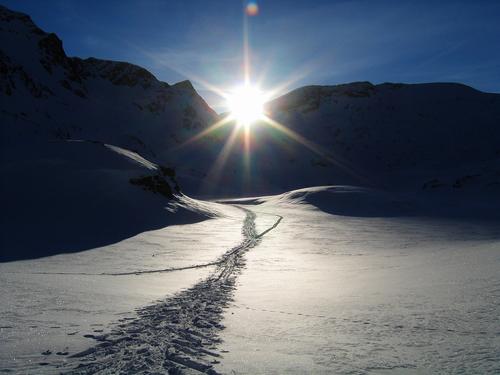| Aber kurz nach 15 Uhr verzieht sich die Sonne hinter dem Znachsattel zwischen Znachspitze und Lungauer Kalkspitze. Im Vordergrund die Spuren über den Giglachsee. |