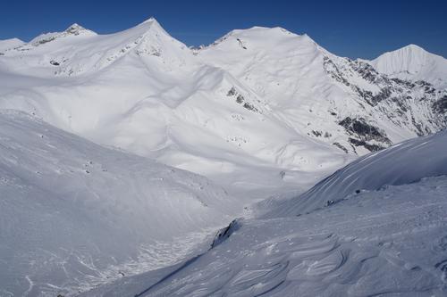 | Über die "Wintergasse" steigen einige Schifahrer auf (unterhalb der Bildmitte). Im Hintergrund das Gipfelpanorama um Sonnblick und Hocharn. |