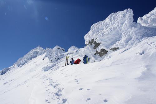 Schließlich ist der Grat erreicht. Im Schutz einer Wechte wird das Schidepot eingerichtet.