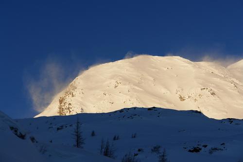 Kurz nach Sonnenaufgang zeigt sich, welches unwirtliche Wetter wir heute in größeren Höhen erwarten müssen.