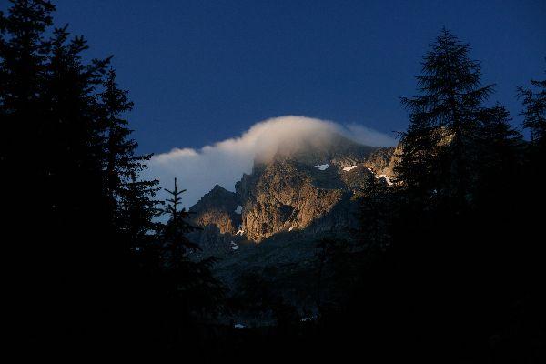 | Während es im engen Schödergraben (sogar das GPS versagt kurzzeitig seinen Dienst) noch dunkel ist, werden die Gipfel bereits von der aufgehenden Sonne erhellt. |