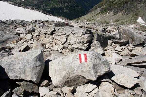 ... und in leichter Felsblockturnerei führt der gut markierte Weg abwärts in die Muritzenscharte ...