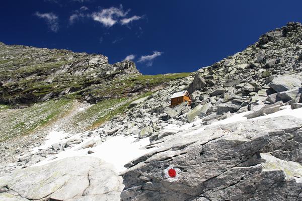 ... ehe ich am Albertbiwak vorbei auf teilweise durchbrechenden Schneefeldern tiefer steige.