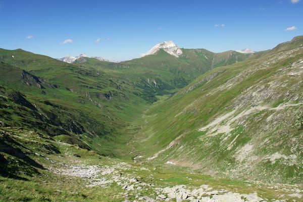 | ... und macht sich in anfänglich noch niedlich wirkenden Mäandern auf ihren ca. 450 km langen Weg. Über dem Tal thront das Weisseck, mit 2.711 Metern Höhe der höchste Gipfel der Radstädter Tauern. |
