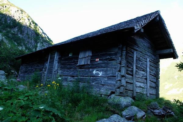 Bei einer Hütte erreicht man ein kleines, zumindest heute rechts sumpfiges Plateau.