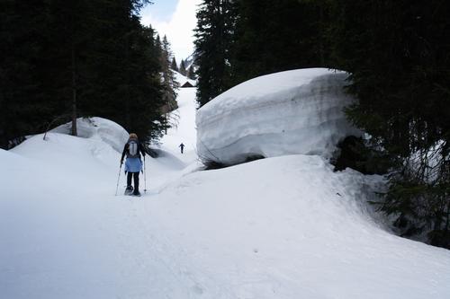 | Meterhoch liegen die Schneemassen im Bereich der Langpoltenalm. Vor uns der einzige Wanderer, den wir am heutigen Tage treffen sollten. Mühsam stapft er mit den Bergschuhen durch den Schnee - stellenweise bricht er bis zu den Knien ein. |