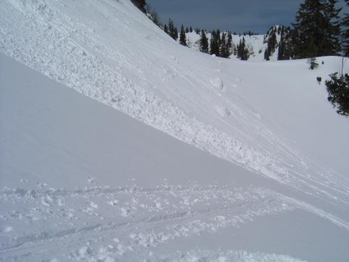 Aus den steileren Hängen gibt es viele kleinere Schneerutsche. Dieser hier geht kurz hinter Karl ab und scheint ihn zu verfolgen.