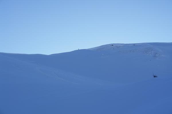 | Der felsige Grat zwingt mich zuletzt wieder zu einem kurzen Abstieg. Oben am Hintergullingspitz genießt gerade ein Schitourengeher das Gipfelglück. Etwas später wird er - an mir vorbei - den Pulvertraum auskostend - Richtung Norden abfahren ... |