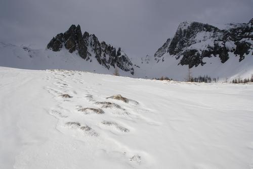 | ... sieht man bereits in die "Hölle", wie der wunderschöne Kareinschnitt zwischen den markanten Felszacken des Kempen (links) und dem mächtigen Weißeck (rechts) genannt wird. Leider ist es ziemlich wolkig, und kalter Wind fegt Schneefahnen über den Boden. |
