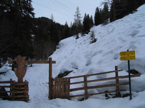 | Start bei einem kleinen Parkplatz in Grund, im hinteren Ellmautal. Kurz vor uns starten 2 weitere Schitourengeher. Die Route führt entlang des markierten Sommerweges auf einer schmalen Schneise, die wir uns bei der Abfahrt lieber erspart haben, hinauf zur Filzmoosalm. |