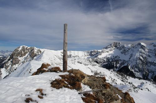 Eine einfache Stange kennzeichnet den Gipfel. Kalter Wind bläst uns um die Nase.