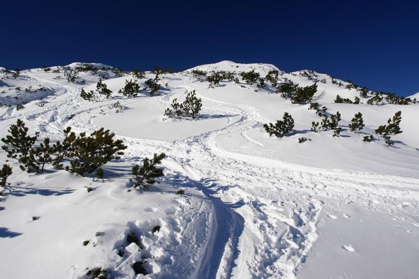 | Nach einer kurzen, steileren Passage wird es weiter oben wieder flacher und über die latschenbewachsene Ostseite gelangt man unschwierig auf den Gipfel. |