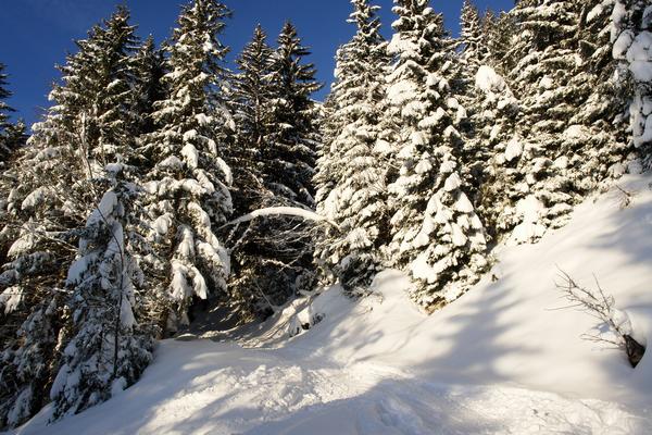 | ... lasse ich links liegen und folge noch ca. 200 Meter der geräumten Forststraße auf angenehmer Schneefahrbahn bis zu einer scharfen Linkskehre (ca. 1.210). |