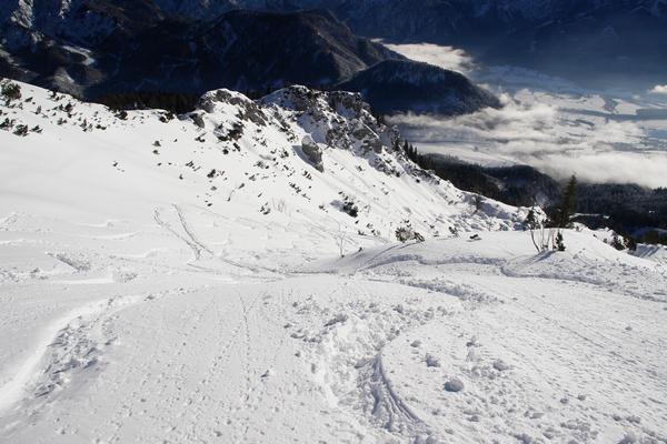 | Bald aber steilt das Gelände ordentlich auf. Die Hangneigung von 30 Grad und mehr erfordert auf jeden Fall sichere Verhältnisse und auch fortgeschrittene Schneeschuhfertigkeiten können nicht schaden. |