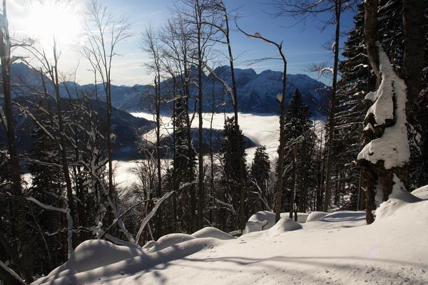 Der lichter werdende Wald gibt jetzt spannende Ausblicke auf das Nebelmeer unten im Ennstal frei.