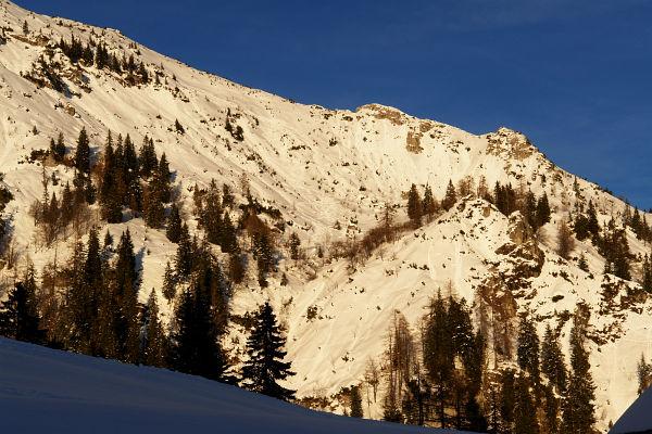 | Im Licht der letzten Sonnenstrahlen kann ich noch einmal gut das steile Abstiegsgelände vom Grabnerstein überblicken (von links oben zur Bildmitte). |