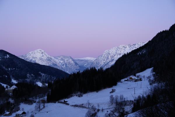 | Start an der Sölkpaßstraße nahe der Jausenstation Langbrucker. Aufstieg über die Zufahrtsstraße zur Schönwetterhütte über das Gehöft Wachlinger. Violett zeigt sich der Himmel über Stoderzinken und Kammspitz. Dazwischen der flache Hirzberg. |