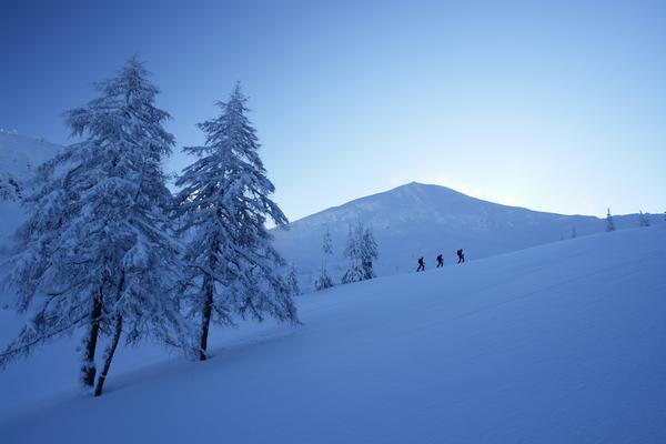 | Aber davon lassen wir uns ebensowenig abhalten wie die Schitourengeher, die heute immer wieder grüppchenweise an uns gen Gipfel vorbei ziehen. |