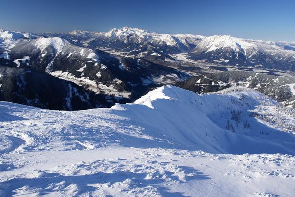 | Eine Weile sehen wir den Schifahrern nach, wie sie nach rechts in das schattige Kar hineinfahren. Blick über das Ennstal. Rechts oberhalb der Bildmitte liegt Gröbming. |