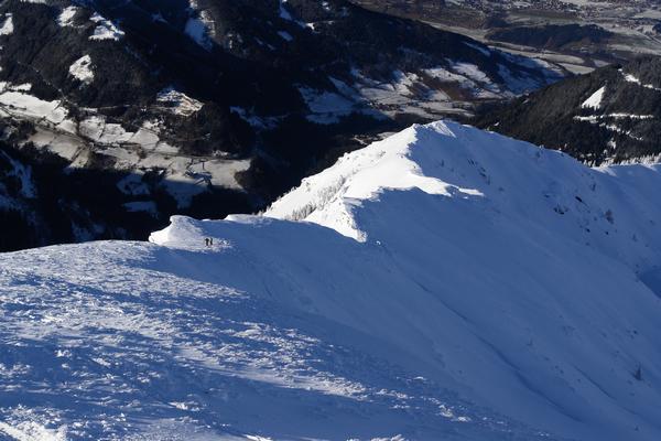 Und da langsam auch Müdigkeit einkehrt, nutzen wir gerne den Ausblick auf die nach uns kommenden Schitourengeher, die wir am Grat erkennen.