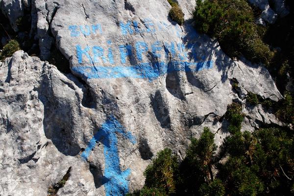 | Dann steuern wir aber unser nächstes Ziel an - dieses Mal wieder in einsameren Gefielden. Der Weg zum Niederen Krippenstein ist offiziell zwar nicht markiert, man findet aber immer wieder deutliche Hinweise. |