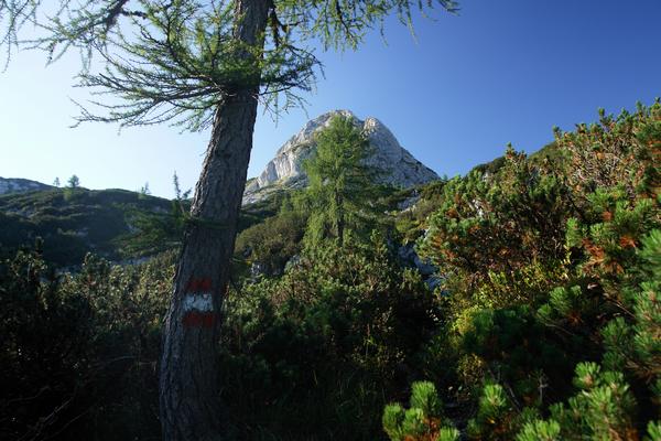 | Nun haben auch wir die sonnenbestrahlten Latschenhänge erreicht, obwohl es auch weiter unter im Wald angenehm mild war. Vor uns das erste Gipfelziel: Der Däumelkogel |