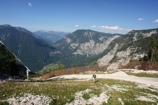 | ... und die vielen Steine machen das Gehen nicht unbedingt leichter. Umso erstaunter sind wir, als uns hier ein im Aufstieg befindlicher, sein Mountainbike schiebender, mit Vollvisierhelm und Hund ausgestatteter, trotz Steilheit und Hitze kaum keuchender Sportler entgegenkommt. |
