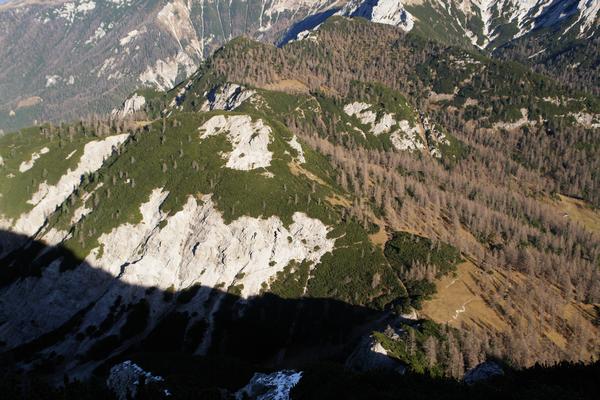| Von der Türkenkarscharte plane ich noch einen kurzen Abstecher auf die bis oben hin bewaldete Kuppe der Kleinen Scheibe - auch Türkenkarkopf genannt. |