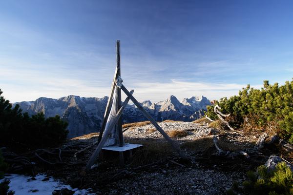 | Vom Abstiegsweg vom Hirscheck, bei dem ich mich mehr schlecht als recht durch dichtes Latschengestrüpp kämpfte, weil ich es irgendwie nicht geschafft habe, einen halbwegs vernünftigen, durchgehenden Steig zu finden, habe ich keine Fotos. Hier stehe ich schon am Gipfel der Kleinen Scheibe. Das Gipfelzeichen - geziert mit einer Pfoad (umgangssprachlich für Hemd). |
